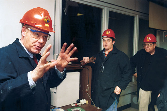 A fire chief conducts community risk reduction training.