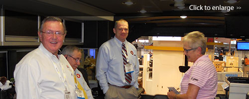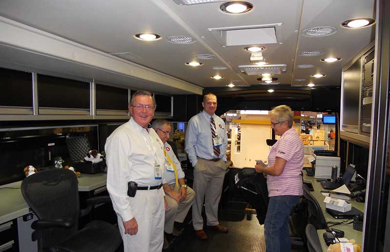 Here's a view inside the MCC bus. Pictured are Jerry Davies, assistant vice president, Farmers; Joe Fratantaro, manager, ISO Community Hazard Mitigation (seated); Bob Andrews, vice president, ISO Community Hazard Mitigation; and Verdan Glenn, support specialist, Farmers.
