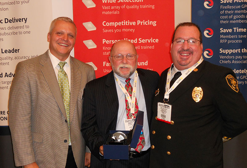 WFCA Chief Executive Officer Jeff Johnson (left) and Tucson Fire Chief and WFCA President Jim Critchley (right) present ISO National Director Robert “Butch” Cobb with the WFCA President’s Award at the IAFC Fire-Rescue International conference in Denver.